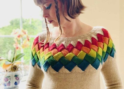 Stellara is knitted from the top down and features a dramatic entrelac yoke and coordinating stripes. The yoke is inspired by the colourful spiral galaxies in our Universe. The entrelac yoke combined with positive ease gives a slightly slouchy, comfortable fit. The pattern includes detailed instructions for working the entrelac stripes.