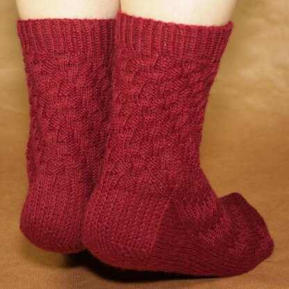 The leg and top of foot have a textured pattern formed using knit and purl stitches. Lightly stretched this looks like cables, more of a stretch reveals the textured stitches.