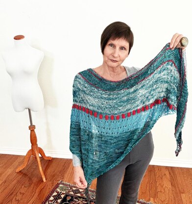 It grows all along the sides and middle section with eyelets and stockinette knitting. Color changes and multiple stitch patterns to try, including a pretty lace, a slipped stitch pattern and smocking, which is fun to do. The bind off done with three yarns held together to make it a prominent edge. The pattern is fully written and also offers several charts.