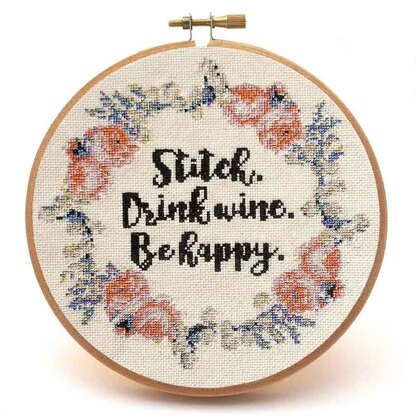 Have you ever wondered what your motto in life should be? Here's one to consider! Stitch, drink wine, and be happy are inscribed in this pretty cross stitch pattern in flowing calligraphy, reminding you to focus on the important things in life. The lovely wreath of roses features stylish colours such as rich oranges, pinks, and lovely antique blues. The pattern includes a full colour pattern and thread sorter. Model stitched on 14 count Fiddler's Cloth (Oatmeal Aida). Floss colours needed are (one skein of each): DMC Stranded Cotton - 931, 3072, ECRU, 317, 3033, 778, 3046, 792, 922, 310, 3778, 644, and 760.