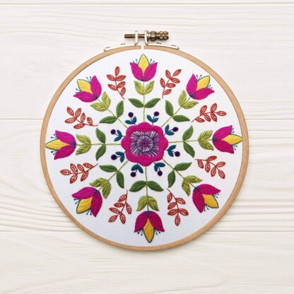 Beautiful, Colourful and Fun Hand Embroidery Designs Discover your next stitch journey.\n\nHere at Stitchdoodles we are all about creativity. Sitchdoodles was created in 2019 after I was finding it difficult to find hand embroidery patterns that were exciting and a bit different from the usual. Wanting to combine our love of hand embroidery stitches, traditional sampler techniques as well as quilt designs(!) I decided to come up with something myself and it has evolved into an array of wonderful and colourful designs that will hopefully inspire and excite people to pick up a needle and get 'happy stitching’.\n\nWhat you will receive:\n• This pattern is available as a PDF download so you can access the pattern as soon as you would like.\n• Each pattern comes with details on the colors, threads, and materials required.\n• Easy to follow instructions are given along with full-color photos.\n• All templates are provided actual size.\n\nA gorgeous flower embroidery design for you to create a modern piece of embroidery hoop art.\n\nFloribunda! Floral Hand Embroidery Pattern details the floss and stitches I used in the example photo but feel free to make your own choices – it’s up to you! The Design is approximately 7 inches.