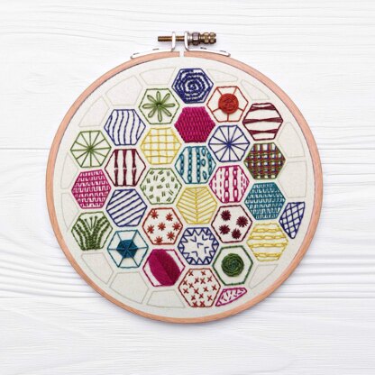 Beautiful, Colourful and Fun Hand Embroidery Designs Discover your next stitch journey.\n\nHere at Stitchdoodles we are all about creativity. Sitchdoodles was created in 2019 after I was finding it difficult to find hand embroidery patterns that were exciting and a bit different from the usual. Wanting to combine our love of hand embroidery stitches, traditional sampler techniques as well as quilt designs(!) I decided to come up with something myself and it has evolved into an array of wonderful and colourful designs that will hopefully inspire and excite people to pick up a needle and get 'happy stitching’.\n\nWhat you will receive:\n• This pattern is available as a PDF download so you can access the pattern as soon as you would like.\n• Each pattern comes with details on the colors, threads, and materials required.\n• Easy to follow instructions are given along with full-color photos.\n• All templates are provided actual size.\n\nThis hexagon embroidery sampler has been designed for beginners to create a fabulous pattern whilst learning 20 hand embroidery stitches. This is a wonderful way to learn and start you on your embroidery journey.\n\nThe Hexagon Sampler to learn 20 hand embroidery Stitches pattern details the floss and stitches I used in the example photo but feel free to make your own choices – it’s up to you! The Hexagon Sampler to learn 20 hand embroidery Stitches Design is approximately 7 inches round.
