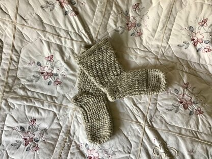 Textured socks with raised stitches. Unique rolled edge. Crocheted entirely in one piece. So versatile and stylish. One size fits all! Simple crochet stitches throughout.