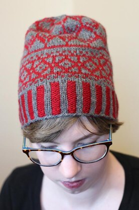 Knit from the bottom up in the round with deep corrugated ribbing for the hem, this hat has a simple eight stitch repeats to form the pattern. The pattern will work best in solid and semi-solid yarns with some contrast.