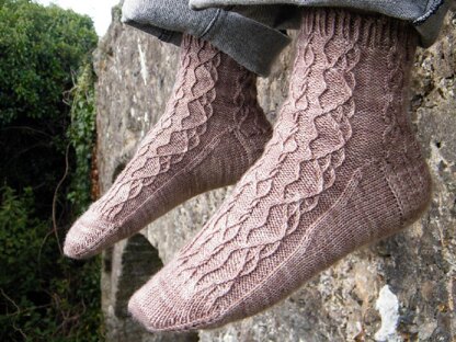 Twisted stitches adorn the ankle and reach down the toes, engraving meandering cables and subtle hearts into wool.
