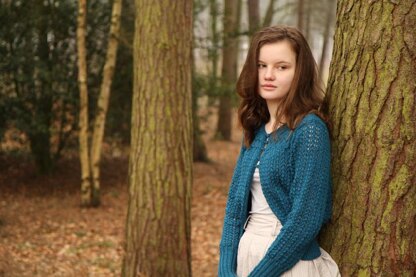 A flattering cardigan for summer evenings. The cardigan features a deep rib hem, followed by a pretty lace pattern to the armholes, and ends with a clever mock cable stitch at the yoke.