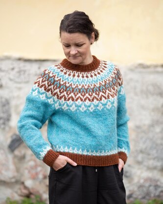 Stormur means storm in Icelandic. Stor Stormur is the big brother (or sister) of the Stormur pullover and is inspired by traditional Icelandic motifs. Can you see a fleet of viking ships sailing in a storm? The sweater is worked from the top-down and short rows lift the back neck taller than the front.