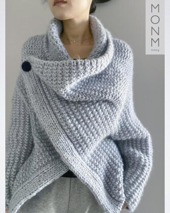 Storm coat is an asymmetrical oversized knitwear with various ways to wear. This chunky garment features seamless overall look with textured stitch, exaggerated collar, long-short front and back, wide double knitting trims and statement button. Storm coat is worked from top down in textured stitch in one piece.
