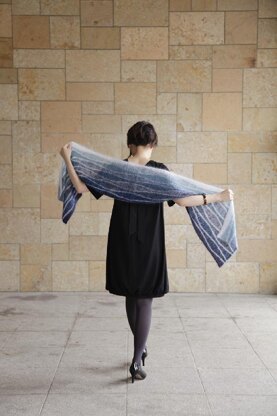 Stormy Seas is a stole or a long scarf. It is knitted sideways. Short rows are used to create the wavy shapes which are knitted in garter stitch with 2 strands of Rowan Kidsilk Haze held together. The four colourways are used in different combinations to derive additional shades of blue. The pale blue lines separating the waves are 2 rows of stocking stitch with a single strand of yarn. Beads are used on 2 of the waves placed in random fashion to evoke the sense of froth of stormy seas.