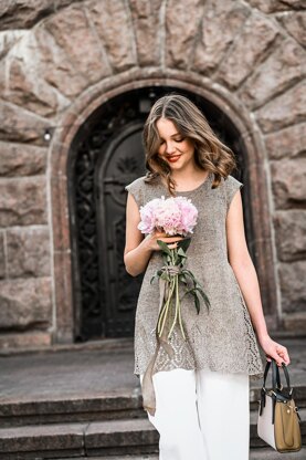 “Story of Hope” top is worked from the bottom up in one piece in the round. The lace pattern of the bottom border smoothly flows into the lace side inserts. At armhole level, work is divided into Front and Back, which are finished separately, shoulder seams are joined using the three-needle bind-off method.