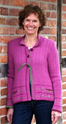 Written pattern in German with chart and schematics. Material: 11 - 14 skeins in Pink, 1 skein each in Green and Dark Red, 4 Buttons (3 in Dark Red and 1 in Green), some beads in Green, a short cut of fine Green ribbon.
