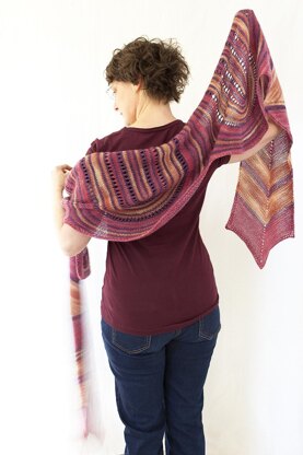 Stratimology is a stole with an unexpected construction. It is worked in different knitting directions and starts from the center out with arched modules. This means that Stratimology grows in a fun and unexpected way. Three different colorways accentuate the direction changes. The stole is modular, meaning that you can add or remove central modules to make it larger or smaller. Next to that, the wings are easily customizable in length.