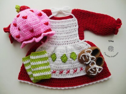 • Pattern includes: hat, dress, leg warmers, apron and shoes.