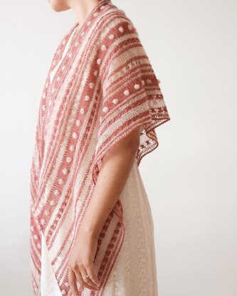 The pattern was designed to highlight the beauty of combining kid mohair with fingering weight yarn. The shawl is completed in a V-shape which is easy to knit and very comfortable to wear. Light weight and generous size make it a lovely addition to transitional weather wardrobes.