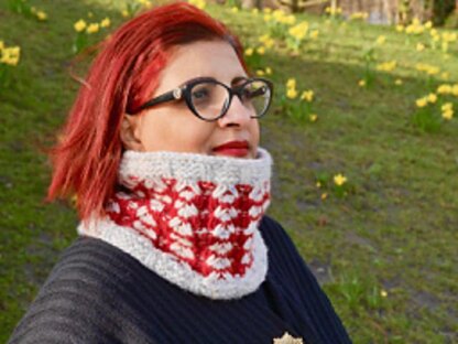 Designed for newcomers to colourwork, with bold colours and lines and a simple slip-stitch cable pattern that is fun and quick to knit. This cowl is very cozy in winter and easily fits under coats to keep out icy drafts.