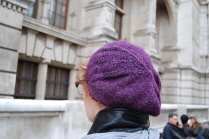 A slouchy beret with a lace panel on a bed of reverse stockinette stitch.