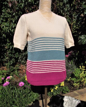 With blocks of narrow and wide stripes this easy knit top is fun to make. All in stocking stitch with ribbed borders and a cute v neck.