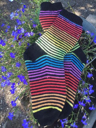 Stripease is a toe-up sock with jogless stripes, a gusset and partridge stitch heel flap. The jogless technique is slightly different from other jogless stripe methods and works well for narrow two-stripe repeats.