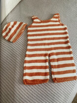 The dungarees are knitted from the bottom up and the hat is knitted on straight needles and seamed but could be altered to knit in the round. For the smallest size you will need 2 skeins of each colour. The yarn is sports weight.