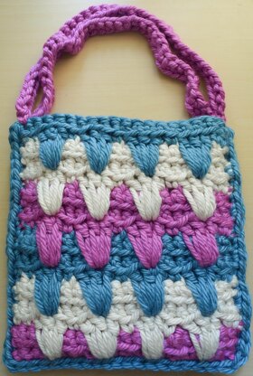Materials for Bag Bernat Mega Bulky Yarn, or approximately 80 yd (73 m) in ea of 3 colors in any jumbo weight yarn.