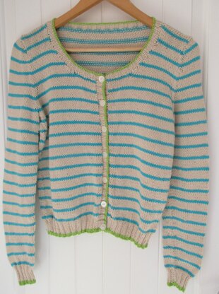 This is a pattern for a striped cardigan, originally published in Simply Knitting. It is a simple shape in fresh stripes with contrast tipping. Length 54-58 cm.