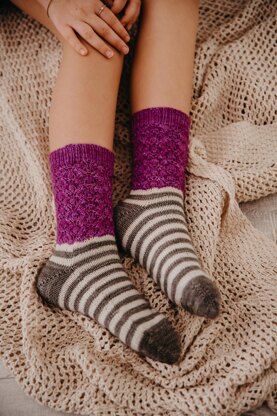 The socks are worked upwards from toe to cuffs. The foot of the sock is worked in a simple striped pattern in two colors. The heels are shaped using w&t short rows. The leg of the sock features beautiful lace patterning in a third contrasting color. The socks are finished with short ribbed cuffs.