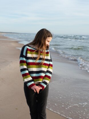The Striped Muse sweater is a simple capsule wardrobe piece, great for everyday outfits. The sweater is striped, featuring five colors that repeat throughout. Created with a clean and modern look, the yoke is worked flat, while the body and sleeves are knitted in the round. The neckline of the Striped Muse sweater is deeper than the Ruke Muse sweater. With no complicated stitches or advanced techniques, it’s a suitable project for beginner knitters. All edges, including the neck, naturally curl for a soft finish. The Ruke cast-off adds a subtle decorative touch to these edges. This sweater is ideal for transitional seasons when heavy knits feel too warm.