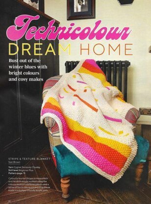 This is a pattern for a chunky texture and blocks blanket, originally published in Knitting magazine. It has moss stitch stripes with a simple intarsia at the centre, fine for a beginner. Garter stitch edges. Photos Knitting magazine.