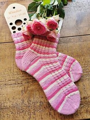 Sock Construction: Knitted toe up using Magic Loop and Heel Flap. The pattern has a contrast coloured toe, heel and cuff. The pattern is a 4 stitch repeat with textured detail.