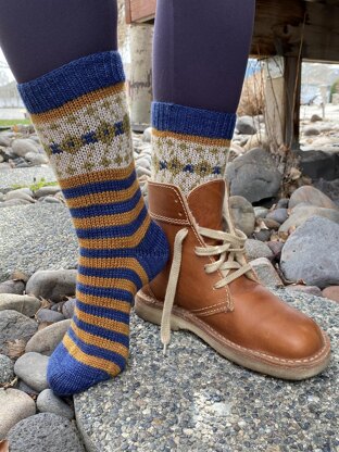 The idea of this sock came from wanting a bit of interest added to a simple striped sock. This design will peek above boots to show off the fun colorwork, and hidden below is the fun stripes.