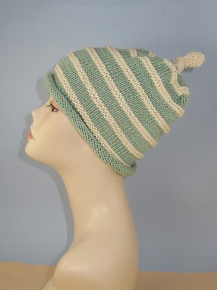 This is my Stripey Roll Brim Topknot Slouch Hat. This is a very simple hat to make yet the end result is quite stunning. This range of hats has been specially designed for summer wear so the yarns chosen are all cool to wear like cotton and bamboo. The knitting pattern provides full written instructions for 4 sizes, XS (baby), S (child), M (teen/ small woman), l (woman/man) and there are step by step photos to help you with the simple makeup.