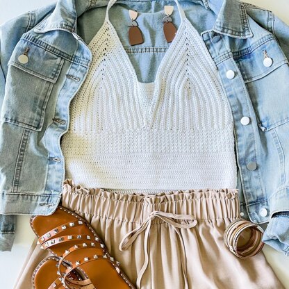 The Stroll In The Park Halter Top makes the perfect addition to your summer wardrobe. The halter top has an open back with straps to tie around your neck. The top is crop length but can easily be altered to any length. Bra size from 30-46 and includes a YouTube tutorial for size 34. Style guide included featuring different outfits for every season. Designed in Knit Picks/WeCrochet Stroll fingering weight yarn.