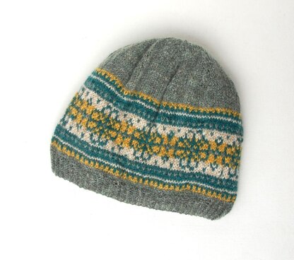 This is a pattern for a knitted beanie, with a bit of slouch, worked from the bottom up and in the round, using the Fair-Isle knitting technique.