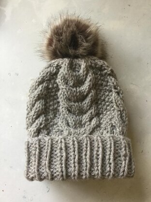 Its' a snug fit cabled beanie hat with a ribbed double cuff hem. A great essential for Men and Women and super cute on kids. One size fits most and is easily adapted. This is a quick knit, worked on big needles with chunky yarn. Jo x