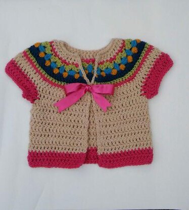 Colourful short sleeve cardigan worked from the top down.