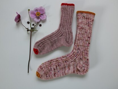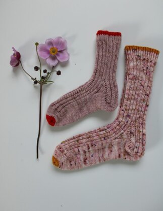 XS: Tausendschön SoWo 4ply, col. Nude, scrab Rot Tausendschön S: Lana Grossa Meilenweit Tweed, grau, scrab Royalblau Tausendschön M: Mominoki Sock 4ply, col. Chestnut, scrab Azur Tausendschön