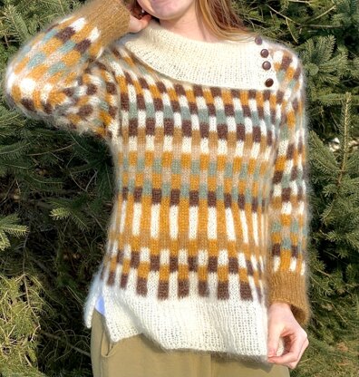 I had seen a manufatured similar design while out shopping and thought it woudl be cute to knit up by hand. Therefore, I designed this pattern. It is knit from the bottom up with a split hem then joined to work in the round. I used a modified drop shoulder finished with a tapered top for a flattering fit. This technique eliminated the need for short rows across thte back neckline. The eye-catching collar softly folds over and is split at one shoulder adorned by coordinating butons.
