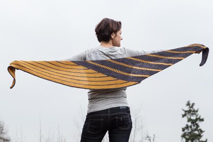 This shawl is knitted from side to side with two different sections. It is shaped with increases on the top edge of the shawl and with short-rows in which the rhythm of the stripes changes. The shawl is worked with techniques which enable minimal finishing – you do not have to cut yarns during this project. This is perfectly sized shawl to wear with winter outfits.