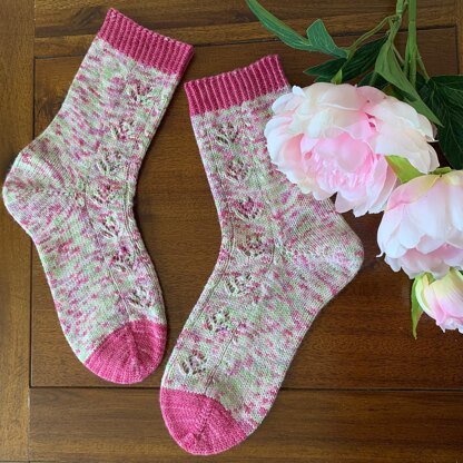 The Summer Blooms Socks are knit from the toe up with a delicate cable and flower lace panel on the front side of each sock. A balance of enough detail to keep the mind interested but also enough mindless vanilla knitting once the lace stitches are worked.