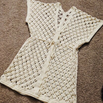In order to make this cover-up, two identical panels are crocheted (which make the left and right side of the full piece). Then it’s just seaming them together, crochet an edging for the neckline, armholes, and bottom and finish it off by crocheting a cord for a more fitted look. It’s that easy!