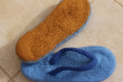 Summer Flippers - these felted flip-flops are perfect for summer days, when it's too hot for normal slippers, but floors are still cold. The seamless slippers are easy to make and can be made within an evening. They have a double sole and an inset plastic sole, so these warm slippers make the typical flip-flop sound.