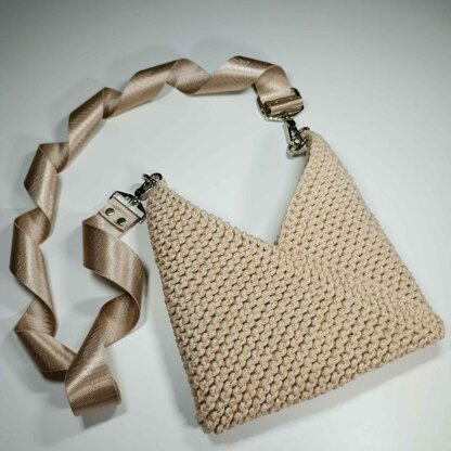 The finished bag is worked in one piece and then folded to create its unique shape. The pattern includes a full photo tutorial for the folding and seaming process.