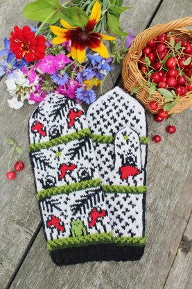 Materials• US Size 0 (2mm) set of dpns or circular needles (for Magic Loop method); US size 00 (1.75mm) for ribbing (optional) • Fingering weight yarn – 231y/50 g (211m/50g). You will need about 325y (70g): Color BC (white) – 130y (28g), CC1 (black) - 130y (28g), CC2 (dark green) – 37y(8g), CC3 (light green) – 27y (6g), CC 4 (red) – 10y (2g). Depending on what shade of green you use for the frogs and dragonflies, you will need a bit more of either dark or light green • Tapestry needleGauge9 sts x 13 rows (in stranded knitting in the round) in 1” x 1” after blocking