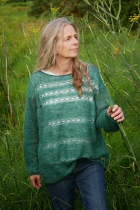 Designed for light layering, this modified dropped shoulder sweater celebrates transparency using a laceweight silk/mohair blend. Large eyelets feature on the front of the garment.