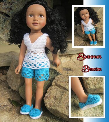 Pretty crocheted 2 piece shorts and summer top with matching espadrilles for 18inch doll. top fastens at the back with one button as do the shorts.