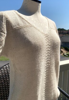 Summer Stock is a short-sleeve tee that is easy to wear alone, or over tanks & dresses. Constructed in one piece from the bottom-up, the sides feature a geometric lace inset, which is repeated at the back yoke and front shoulders, plus a center pair of mini cables that divide to frame the V-neck. The pullover is worked in the round up to the underarm increases, with front & back worked flat to a 3-needle bind-off at the shoulders. I-cord edging is integrated at all edges, providing a neat finish as you go.