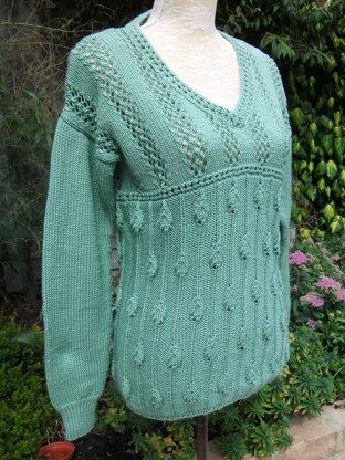A truly pretty sweater for summer - or any season. The main body of the sweater consists of small “medallion” leaf panels which alternate on the single rib background stitch. This may look complicated but it is easy to work. The yoke is in a 4 row eyelet lace pattern - wrong-side rows are all purl. The sleeves are in stocking stitch with a simple rib cuff. The V neck is edged to match the lower border.