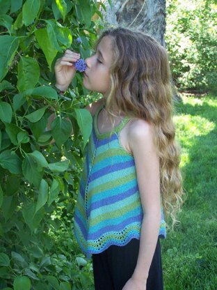 This tank is knit from the top down, beginning with the folded neckband. The front and back (which are the same) are worked separately to the underarm, after which the piece is worked in the round to the end. The yarn used in the sample is machine washable and doesn’t need re-blocking after each washing.