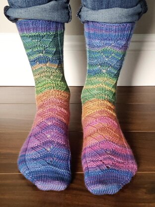 Summerland Socks include some of my favourite things: Stripes, intuitive lace, colourful purl blips.