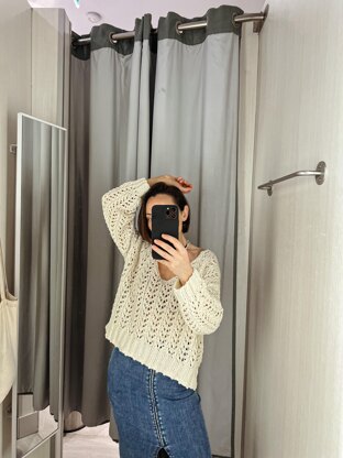 The pattern is written for 3 sizes. 1 (2) 3 with a finished bust circumference of 150 (160) 170 cm | 59 (62,99) 66,9 in. 20-30 cm| 7,8-11,8 in. of positive ease. Width/length: 56cm (22 in)/50cm (19,6 in); 62cm (24,4 in)/52cm (20,4 in); 68cm (26,7 in)/54cm (21,25 in)
